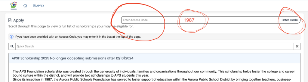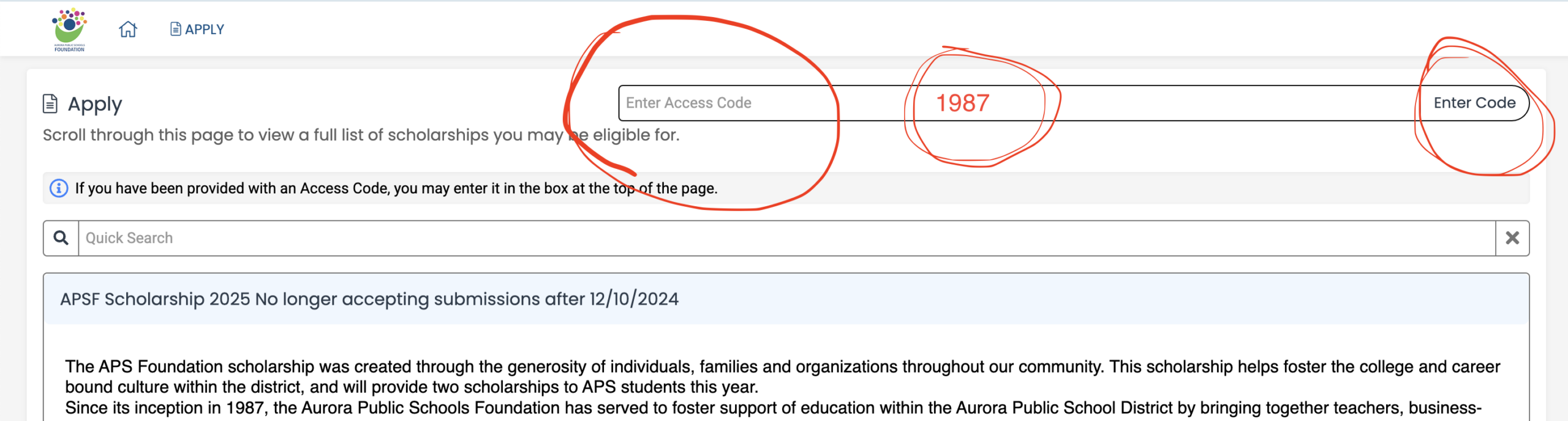 - Application Code – when you are logged in, click “Apply” at the top of the page, and you will see a box that says “Enter Access Code”. Type the access code for this application – 1987 – and click on “enter code.”